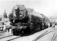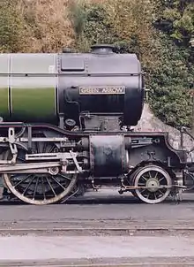 There were a number of issues with the Gresley gear. Because the conjugation apparatus was mounted at the opposite end of the valve spindles from the valve gear, as the valve spindles lengthened with the heat of steam in the cylinders the valve timing would be affected, and the gear would need to be removed before it was possible to remove valves for maintenance.[3] However, the B17 Class "Footballer"/"Sandringham" 4-6-0s avoided this particular problem by being designed with the conjugated gear behind, rather than in front of, the cylinders.[4] The main difficulty with this valve gear was that at high speeds, inertial forces caused the long conjugating lever to bend or "whip".[5] This had the effect of causing the middle cylinder to operate at a longer cutoff than the outer cylinders, therefore producing a disproportionate share of the total power output, leading to increased wear of the middle big end. Sustained high speed running could sometimes cause the big end to wear rapidly enough that the increased travel afforded to the middle piston by the increased play in the bearing was enough to knock the ends off the middle cylinder. This happened during the 113 miles per hour (200 km/h) run of "Silver Fox".[6] Although the problem could be contained in a peacetime environment with regular maintenance and inspections, it proved to be poorly suited to the rigors of heavy running and low maintenance levels of World War II. This gave rise to big-end problems on the centre cylinder connecting rod on the famous A4 class of streamlined Pacifics and many of these locomotives were fitted with a reduced diameter piston and had the inside cylinder sleeved down as a temporary measure. LNER Class A4 4468 Mallard suffered centre cylinder big-end damage (indicated to the driver by the fracture of a "stink bomb" attached to the bearing, which fractures during overheating of the white metal) during its world record run and was forced to limp back to its depot for repairs afterwards. Gresley's successor at the LNER, Edward Thompson, was critical of this particular valve gear.[7] As well as introducing new two-cylinder designs, he set about rebuilding Gresley locomotives with separate sets of Walschaerts valve gear for each cylinder.[8] Under later British Railways ownership, the application of former Great Western Railway workshop practices for precise alignment of the valve gear and in the manufacture and lubrication of the inside big end bearing effectively solved the problems.