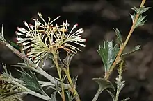 Grevillea acrobotrya is a spreading to erect shrub that typically grows to a height of 0.6–2 m (2 ft 0 in – 6 ft 7 in) and has woolly-hairy branchlets, but glabrous flowering branchlets. Its leaves are egg-shaped with the narrower end towards the base, or trowel-shaped, 6–40 mm (0.24–1.57 in) long and 10–35 mm (0.39–1.38 in) wide with five to nine sharply-pointed lobes. The branches bearing flowers have smaller leaves that have three narrowly triangular, sharply pointed lobes and are up to about 7 mm (0.28 in) long. The flowers are arranged in more or less spherical groups on the ends of branches and in leaf axils, each flower on a pedicel 5–7 mm (0.20–0.28 in) long, the perianth white to cream-coloured, the limb chocolate-coloured and the pistil 3–4 mm (0.12–0.16 in) long. Flowering occurs in most months with a peak from June to September and the fruit is a smooth, oblong follicle mostly 8–11 mm (0.31–0.43 in) long.[2][3]