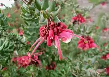 Grevillea baueri is a low, spreading to erect shrub that typically grows to a height of up to 0.3–1.5 m (1 ft 0 in – 4 ft 11 in). Its leaves are simple, oblong to egg-shaped, 10–30 mm (0.39–1.18 in) long and 3–15 mm (0.12–0.59 in) wide with the edges turned down or rolled under, the lower surface more or less glabrous. The flowers are arranged in groups of eight to eighteen near the ends of branches or in leaf axils on a rachis 2–5 mm (0.079–0.197 in) long, and are red to pink and cream-coloured to yellow near the tip, with a red style. The pistil is usually 16–23 mm (0.63–0.91 in) long, the ovary covered with long hairs. Flowering mainly occurs in winter and spring and the fruit is a hairy follicle 13–14 mm (0.51–0.55 in) long.[2][3][4]