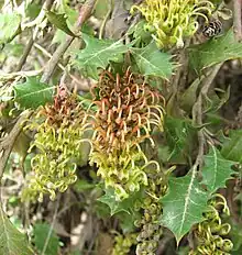 Grevillea bedggoodiana, commonly known as Enfield grevillea,[2] is a species of flowering plant in the family Proteaceae and is endemic to a restricted area near Ballarat in Victoria, Australia. It is a prostrate to low-lying shrub with coarsely serrated, egg-shaped to oblong leaves and green and pink flowers.