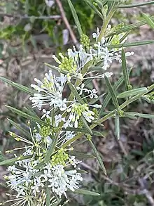 Grevillea biternata is a shrub that typically grows to a height of 1–2.5 m (3 ft 3 in – 8 ft 2 in) and usually has branchlets densely covered with soft, woolly hairs. The leaves are usually divided with two to three linear lobes, the lobes 15–40 mm (0.59–1.57 in) long, 1.0–2.8 mm (0.039–0.110 in) wide and sharply pointed. The flowers are arranged in cone-shaped or cylindrical groups of eight to thirty on a rachis 7–20 mm (0.28–0.79 in) long, and are pale pale green in the bud stage, later white. The pistil is 3–4 mm (0.12–0.16 in) long. Flowering occurs from July to November and the fruit is an oblong follicle 7–10 mm (0.28–0.39 in) long.[2][3][4]