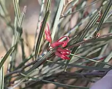 Grevillea extorris is an erect shrub that typically grows to a height of 1–2.5 m (3 ft 3 in – 8 ft 2 in). Its leaves are linear to narrowly oblong, 40–120 mm (1.6–4.7 in) long and 1–3 mm (0.039–0.118 in) wide. The edges of the leaves are turned down or rolled under, the upper surface of the leaves silky-hairy at first, later glabrous, the lower surface silky-hairy or obscured. The flowers are arranged on the stems or in leaf axils in clusters of three to twelve flowers on a rachis 0.5–4 mm (0.020–0.157 in) long. The flowers are pink to red or yellow, the pistil 28–38 mm (1.1–1.5 in) long. Flowering occurs from April to September and the fruit is an oval follicle 11–15 mm (0.43–0.59 in) long.[2][3]