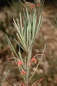 Grevillea haplantha is a shrub that typically grows to a height of 0.6–2.2 m (2 ft 0 in – 7 ft 3 in). Its leaves are linear, 15–80 mm (0.59–3.15 in) long and 1.0–1.7 mm (0.039–0.067 in) wide with the edges rolled under, obscuring most of the lower surface. The flowers are arranged in loose clusters of up to six in leaf axils or the sides of branches on a rachis 0.7–1.5 mm (0.028–0.059 in) long, the pistil 18–25 mm (0.71–0.98 in) long. Flowering time and colour vary with subspecies. The fruit is an oval to elliptic follicle 10–13 mm (0.39–0.51 in) long.[2][3][4]