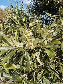 Grevillea helmsiae, commonly known as Helms' grevillea, is a species of flowering plant in the family Proteaceae and is endemic to Queensland. It is a shrub or tree with elliptic to narrowly egg-shaped leaves with the narrower end towards the base and small clusters of white to cream-coloured flowers with a green style.
