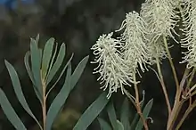 Greville polybotrya is an erect, bushy shrub that typically grows to a height of 1–4 m (3 ft 3 in – 13 ft 1 in). Its leaves are egg-shaped to lance-shaped with the narrower end towards the base, or oblong, 12–50 mm (0.47–1.97 in) long and 4–9 mm (0.16–0.35 in) wide. The edges of the leaves are thickened, both surfaces similar and more or less glabrous. The flowers are borne on panicles held above the rest of the foliage, the panicles with 10 to 20 cylindrical branches 60–80 mm (2.4–3.1 in) long. The flowers are pinkish-cream in the bud stage, later white to cream-coloured and have a caramel-like scent, the pistil 7.5–10 mm (0.30–0.39 in) long. Flowering mainly occurs from September to December and the fruit is an oval follicle 11–15 mm (0.43–0.59 in) long.[2][3]