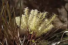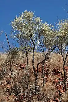 Caustic bush grows in a range of soil types.[3] Subspecies leucadendron grows in open grassy woodland in the Carnarvon, Central Kimberley, Dampierland, Great Sandy Desert, Northern Kimberley, Ord Victoria Plain, Pilbara, Tanami and Victoria Bonaparte bioregions of northern Western Australia and the Northern Territory.[8][9] Subspecies longiloba grows in open grassy woodland in the Northern Territory, mainly in the Katherine area[11][12] and subsp. pyramidalis grows in low woodland between Broome and the Prince Regent River in north-western Western Australia.[14][15]