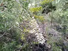 Grevillea subtiliflora is an open, erect shrub that typically grows to a height of 1.0–2.5 m (3 ft 3 in – 8 ft 2 in) and has densely silky-hairy branchlets. Its leaves are pinnatisect, 25–45 mm (0.98–1.77 in) long with 3 to 11 lobes that are usually further divided, the end lobes linear, 5–20 mm (0.20–0.79 in) long and 0.5–1 mm (0.020–0.039 in) wide. The edges of the leaves are rolled under, enclosing the lower surface apart from the midvein. The flowers are borne in cylindrical clusters in leaf axils and at the ends of branches on a silky-hairy raceme 40–80 mm (1.6–3.1 in) long. The flowers are yellowish green in the bud stage, later white, the pistil 4–5 mm (0.16–0.20 in) long. Flowering occurs from July to October and the fruit is an oval or oblong follicle 8–10 mm (0.31–0.39 in) long.[2][3][4]