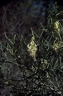 Grevillea triternata is a dense, compact shrub that typically grows to a height of 0.2–1 m (7.9 in – 3 ft 3.4 in). Its leaves are divided, 30–105 mm (1.2–4.1 in) long, with 3 to 5 spreading lobes that are usually divided again, the end lobes sharply pointed, linear to narrowly triangular, 7–47 mm (0.28–1.85 in) long and 0.8–2.8 mm (0.031–0.110 in) wide. The edges of the leaves are usually rolled under, concealing most of the lower surface. The flowers are arranged in cylindrical or narrowly conical clusters on a rachis 10–28 mm (0.39–1.10 in) long, the flowers nearer the base of the rachis flowering first. The flowers are white with a cream-coloured to pale yellow style, the pistil 3.8–5.0 mm (0.15–0.20 in) long. Flowering occurs from August to December, and the fruit is a silky-hairy follicle 6.5–9.5 mm (0.26–0.37 in) long.[2][3][4]