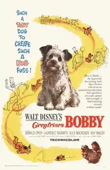 Greyfriars Bobby is a 1961 American drama film starring Donald Crisp and Laurence Naismith in a story about two Scottish men who compete for the affection of a Skye Terrier named Bobby.[2] The screenplay by Robert Westerby was based upon the 1912 novel Greyfriars Bobby by Eleanor Atkinson which was based, in turn, upon an incident in 19th century Edinburgh involving a dog that came to be known as Greyfriars Bobby.[3][4] It was the second film based upon Atkinson's novel, the first being Challenge to Lassie in which Crisp also starred.[5] The film was directed by Don Chaffey and shot at Shepperton Studios and on location in Scotland.[6][2] The film has been released to DVD [7] and Disney+.
