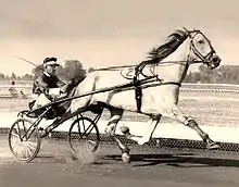 Greyhound was a grey Standardbred gelding by Guy Abbey out of Elizabeth by Peter the Great. Born in 1932, Greyhound was the outstanding trotting horse of his day and arguably the most outstanding in the history of the sport. He was nicknamed "The Great Grey Ghost" and "Silver-skinned Flyer." In 1935, he won the Hambletonian race and in 1938 he lowered the record time for trotting the mile to 1:55ΒΌ. This record stood until 1969.