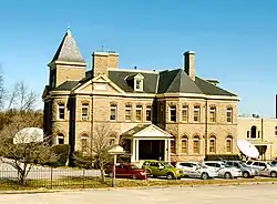 Major Eldad Cicero Camp began constructing his home in 1885. Architect Alfred B. Mullet designed the mansion in the Richardson Romanesque style. Mullett had previously designed the Customs House building in downtown Knoxville. The home is two and a half stories, with a three-story tower in the front. The exterior of the home is sheathed in stone from a quarry in Lake City, Tennessee. The home contains elaborate hand-carved mantels from France. Each room is paneled in a different type of wood. The heads of windows include stained glass panels, and 22 different types of marble are used in the house. The site also includes a carriage house.[2][3]
