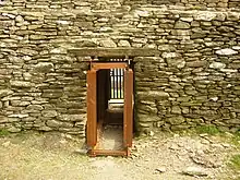 The current hillfort, after the restoration of 1874–1878, is substantially different but much of the old structure remains intact. During the restoration, it was found that parts of the original drystone masonry had been preserved under the collapse. The workers marked, in tar, the undisturbed portions of the cashel and used the collapsed stone to build on this foundation. They supplemented these with other stones from the area to replace those 'removed by King Murdoch O'Brien in 1101'. The internal diameters of the cashel are 23.6 metres north to south and 23.2 metres (76 ft) east to west. The lintel-covered entrance is 4.65 metres (15.3 ft) long, 1.12 metres (3 ft 8 in) wide and 1.86 metres (6 ft 1 in) metres high. Before the restoration, the gateway's lintel was not in place. It was1.3 metres (4 ft 3 in) wide and 1.2 metres (3 ft 11 in) high. It leads into the fort from the east. Slight recesses on either side of the entrance way have been filled in. They were probably to allow double leaves of an original doorway to fold flush against the wall. The interior rises in three terraces accessible by stairways which are previously mentioned. The outer wall is a dry-stone construction. On each side of the entranceway, there are "galleries" within the wall. Their precise purpose is not clear and they do not connect with the entrance. These two wall-passages, one on the south and another from the northeast run towards the gateway, but stop short. The south wall passage entrance is 45 centimetres (18 in) wide, 69 centimetres (27 in) high and 1.4 metres (4 ft 7 in) long. It turns through a right angle where it becomes 50 centimetres (20 in) wide,85 centimetres (33 in) high and 20.4 metres (67 ft) long. Near the north end there is a recess on the west side 50 centimetres (20 in) wide, 1 metre (3 ft 3 in) and 75 centimetres (30 in) deep. The northeast gallery entrance is 65 centimetres (26 in) wide, 97 centimetres (38 in) high and 1.55 metres (5 ft 1 in) long. It meets the main part of the passage in a T-junction. To the north, the passage is 70 centimetres (28 in) wide, 1.3 metres (4 ft 3 in) high and 2.5 metres (8 ft 2 in) long. To the south, the passage is 60 centimetres (24 in) wide, 1.4 metres (4 ft 7 in) high and 8.6 metres (28 ft) long. Near the north of end of the south passage is a small recess in its west wall. At the south end of the north passage there is a seat-stone. The interior of the cashel is fairly level but Petrie recorded the remains of a small oblong church measuring 5 metres (16 ft) by 4.3 metres (14 ft). The walls were 61 centimetres (24 in) thick and not more than 62 centimetres (24 in) high. The structure was constructed of mortar but nothing remains of it today. A drain runs through the cashel wall at ground level on the northwest side. It leads from a midden in the western side of the enclosure that was 1.7 metres (5 ft 7 in) in diameter and one foot deep.