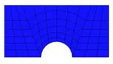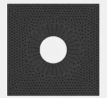 In far more complex geometries it is logical to use large number of blocks and therefore it leads to unstructured grids.[4] These are widely accepted in computational fluid dynamics because this gives us far more flexibility and computer resources are also efficiently utilized. In this case two-dimensional unstructured mesh uses triangle elements while three-dimensional uses tetrahedral elements. These are combination of small structured mesh arranged in unstructured pattern. In this type of grid each single cell is treated as a block. There is no structure of coordinate lines that is given by the grid. The advantage of this type of grids is that mesh can be refined wherever needed. This is based on the fact since the control volume can be of any shape therefore restriction on number of adjacent cell is lifted. This uses various combinations of cell shapes. Hybrid grid can also be used. Hybrid grids are those in which mixture of triangular and quadrilateral elements are used to construct grids. In three dimension combination of tetrahedral and hexahedral elements results in hybrid grid. Example of hybrid grid is shown in Figure 5. Unstructured grids reduces the time which is required for meshing and mapping. Therefore, grid generation is faster and easy. Various automatic techniques especially those associated with Finite Element Method also utilize unstructured grids. Mesh refinement and adaption is easy in unstructured grids.