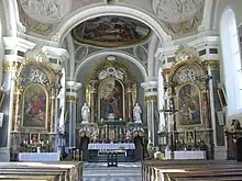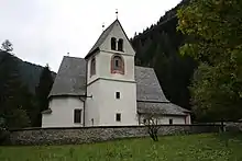 Frederick IV Duke of Austria built at Leug, near the customs station, a small Gothic church, with a wide and squat bell tower looking like Romanesque. In 1684 the church underwent restoration with the addition of a vestibule and turning the interior to Baroque. [5]