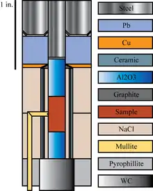 The sample assembly is constructed of multiple cylindrical sleeves which are placed in the opening in the pressure vessel or “bomb”. The outermost sleeve is typically composed from NaCl which is used to transfer the vertical load applied from the steel piston into a confining pressure on the sample at the center of the assembly. NaCl is used since it is relatively weak and it assists in the transfer of stress. Directly inboard of the outer NaCl sleeve is a ceramic support sleeve with a graphite sleeve inside of it, which is used for resistive heating of the sample. The inner most sleeve which houses the sample along with the upper and lower alumina pistons, is commonly also composed of NaCl. In addition to this arrangement, the inner sleeve can also be composed of a ternary eutectic salt mixture which is called a molten salt cell.[1][3] The advantage to the molten salt cell is the salt mixture melts at moderate temperatures which allows for a true hydrostatic pressure to be applied the sample. When using a molten salt cell it also becomes necessary to add an additional nickel capsule to contain the salt mixture in order to prevent damage to other parts of the sample assembly. Temperature is monitored by a side entry thermocouple(s) that penetrate the wall of the graphite furnace and are directly adjacent to the sample, and are typically threaded through protective mullite insulation. The deviatoric stress is transferred to the sample through the σ1 piston. This piston is orientated in series with the upper piston, sample and lower piston within the inner sleeve which all sits on top of a tungsten carbide bottom piston.