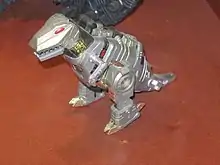 Grimlock is the name of several fictional robot characters in the Transformers robot franchise. He is usually portrayed as the leader of the Dinobots, which are a subfaction of Autobots who can transform into metal dinosaurs. Grimlock was known for his dialogues being spoken in third person. In 2007, USA Today surveyed people as to which Transformer they would want to appear in the second installment in the Transformers film series; Grimlock came in tied for second with Devastator, and he appeared in the film instead of Grimlock. Despite this setback, Grimlock eventually appeared on screen along with his Dinobot friends in the fourth installment of the Transformers film series.