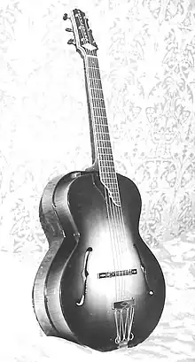 Emile Grimshaw, Snr (1880–1943) was a noted banjo player and educator from the early 1900s onwards. According to this site,[1] Emile Snr had an association with the British Clifford Essex banjo manufacturing company during which time he had some banjos constructed under his name by Robert (Bob) Blake of Finchley, London, which bore the mark "E G" or "Hartford" (the significance of the latter name is unknown); a "Grimshaw Hartford" tenor banjo of unspecified date is illustrated here.[2] In 1933 (other sources say 1930), Emile Snr severed his connection with Clifford Essex and set up his own firm "Emile Grimshaw & Son" together with his son, Emile Grimshaw Jnr (1904–1987) to manufacture guitars and some related instruments. The firm aimed to capitalise on the growing popularity of dance band music, in which players formerly using the banjo were switching to the guitar on account of its increased sonority and subtlety compared with the somewhat raucous sound of the banjo. Unfortunately, this being before the era of amplification, most guitars of the day – typically of the archtop variety – had trouble competing in volume with the louder instruments of the dance band, and Emile Snr, with his background associated with banjos and their construction, decided that the principle of the banjo "resonator" (in effect a second back, to reflect more of the sound forward towards the listener) could be adopted to perform an equivalent function with the archtop guitar. (In fact, possibly unknown to Grimshaw, a similar experimental guitar model had been constructed by C.F. Martin & Company, the well known U.S. guitar manufacturer, who constructed a few such instruments, in both 4-string and 6-string versions, in around 1930 for the Paramount Banjo Co., however the instrument was not a success and only around 36 were produced[3]).