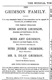 All seven of his surviving children (an eighth, Dean, died as an infant) were musicians who were trained by their father and then went on to study at the Royal College of Music.[3] On January 21, 1896 at the Queen's (small) Hall, Grimson and his seven children performed Mendelssohn's Octet as a family.[4] The concert became an annual event for several years, with the family performing Gade's Octet in 1897[5] and Svendsen's Octet in 1898.[6]