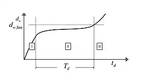 Stage II: During the steady state wear stage reaction forces are constant and the flow of heat generation in both the work piece and wheel remain in equilibrium. The measurable data in this stage presents itself as a linear rate of wear as a function of the working duration of the dresser application or tool life (Td).[6] The tool life corresponds to the grinding wheels ability to maintain the initial shape give to it during the dressing prior to use. As the workpiece stays full contact with the grinding zone in the steady state of constant forces the flow of heat generation in the work piece and the wheel maintains equilibrium. This phase usually does not produce temperatures that would coincide with bond fracture however the material properties of the bond strength can determine the maximum applied force the wheel grit can sustain prior to fracture.[3]