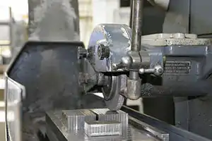Grinding wheel wear is an important measured factor of grinding in the manufacturing process of engineered parts and tools. Grinding involves the removal process of material and modifying the surface of a workpiece to some desired finish which might otherwise be unachievable through conventional machining processes.[1] The grinding process itself has been compared to machining operations which employ multipoint cutting tools. The abrasive grains which make up the entire geometry of wheel act as independent small cutting tools. The quality, characteristics, and rate of grinding wheel wear can be affected by contributions of the characteristics of the material of the workpiece, the temperature increase of the workpiece, and the rate of wear of the grinding wheel itself. Moderate wear rate allows for more consistent material size. Maintaining stable grinding forces is preferred rather than high wheel wear rate which can decrease the effectiveness of material removal from the workpiece.[2]