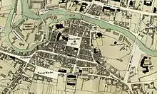 Grodzka Street is a historical street in Old Town of Bydgoszcz, Poland. The street is located in the northern part of the Old Town: it stretches along Brda River waterfront, following an east-west axis. The street starts at the intersection with Bernardyńska street and ends at Tadeusz Malczewski street's crossing. Its length is approximately 430 m. The Grodzka Street was laid out in mid-14th century, when Bydgoszcz became a charter city.[1] Grodzka Street buildings vary greatly one from the other, beginning with the three historic granaries from late 18th century, to the all-glass similar-shape modern mBank in Bydgoszcz, which became an icon of Polish architecture.