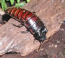 Gromphadorhina oblongonota is one of four roach species in the genus Gromphadorhina,[1][2] which is one of several genera collectively known as hissing cockroaches; like all members of the tribe Gromphadorhini, they are from the island of Madagascar. They are common in the pet trade, where they are known as "wide-horned hissers" and their scientific name is frequently misspelled as either oblongata or oblongonata. This species is difficult to distinguish from the common G. portentosa and is commonly confused with it,[3] although oblongonota tends to be significantly larger and somewhat darker than portentosa.