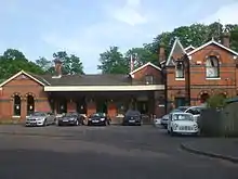 Groombridge station building situated on the east side of Station Road is architecturally "the exact counterpart in miniature of Tunbridge Wells",[7] and constructed of red brick with string courses of blue and white brick, including coloured brick reveals to the doors and windows. The stationmaster's original residence was on the western side of the building adjacent to a booking hall, while at the same time a new goods and parcels office was added to the eastern end of the building, next to the gentlemen's toilets. A subway led from the main platform to the island platform where until 1896 there were no passenger facilities; upon the urging of a passenger, a waiting room and buffet were provided at a cost of £2,300.[8]