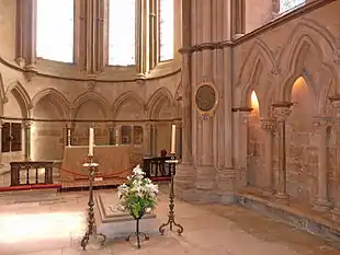 Upon his death, he was almost universally revered as a saint in England, with miracles reported at his shrine and pilgrims to it granted an indulgence by the bishop of Lincoln.[33] However, attempts by successive Bishops of Lincoln, the University of Oxford, and Edward I to secure a formal papal canonisation failed.[33] The attempts to have his canonised were unsuccessful because of his opposition to Pope Innocent IV. The reason for this also seems to be because it was rumoured that Grosseteste's ghost was responsible for the death of the Pope.[34]