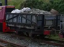 A series of four-wheeled and bogie flat wagons, a large second-hand four-wheeled brake van and a tipper wagon were acquired for maintenance work. To replace a variety of four-wheel wagons that were time-expired, a new bogie works van was delivered to the line in 2011 for use by permanent way crews. This features an open wagon and covered accommodation area.
