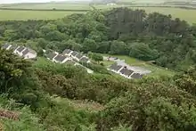 The primary purpose of the halt is to serve the holiday village which was first established in the late 1970s across the road from the halt in the valley; the basic bungalows are of basic chalet construction. Since this time, the top close (cul-de-sac) of bungalows have been modified for residential use whilst the more popular bungalows towards the beach area are retained for letting purposes and remain in regular use by tourists and visitors to the island. There is also a larger detached house above the holiday village known as "Settler's Hollow", once home to the complex's owners and operators, which commands views over the glen and narrow gauge railway. The road which gives access to the development is a public one, which gives car access to the beach and its own car park. It was once a pack-horse lane, and today forms part of the island's Raad Ny Foillan coastal footpath. The stony beach is a popular destination with locals, and was once also accessible from the nearby holiday camp on the adjacent headland.