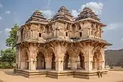 The enclosure is close to the elephant stables; it was thus named in a Persian memoir whose 19th-century translation was an early introduction to Hampi ruins for many.[41] [119] The enclosure contains the Lotus Mahal, the latter being a two-storeyed pavilion in the royal centre.[120] The Lotus Mahal combines a symmetrical, square, Hindu mandala design with lobed arches, vaults, and domes of the Indo-Islamic style. Its basement and pyramidal towers are based on Hindu temple architecture.[120] Like almost all of the structures in Hampi's royal centre, this monument has no inscriptions nor epigraphs mentioning it and therefore dating it and establishing its function with evidence has been difficult. The Lotus Mahal and other structures in the Hampi urban core, however, were not built with Muslim patronage, unlike the tombs in the various Muslim quarters of the city. These buildings reflect the assimilative approach of the Vijayanagara Hindu rulers. Lotus Mahal looks like a syncretic, congested space and its purpose is unclear. Speculations include it being a council hall.[120][121]
