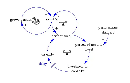 The key to understanding the Growth and Underinvestment Archetype is in the delay in investment. This delay causes the second balancing loop to have longer cycle times than the first balancing loop. That in turn has the following effect: