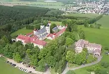 The Hora Matky Boží Monastery pilgrimage complex is formed by the monastery, the Church of the Assumption of the Virgin Mary and the Memorial to the Victims of Internment in 1948–1961. The monastery includes Chapel of the Holy Stairs with cloisters, a crypt, and a pilgrimage house. The way from the town to the complex is lined with Stations of the Cross.[8] The pilgrimage complex with the church is protected as a national cultural monument.[9]