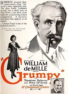 Grumpy is a 1923 American silent comedy drama film distributed by Paramount Pictures. It is based on a 1913 Broadway play Grumpy by Horace Hodges and Thomas Wigney Percyval and starred English actor Cyril Maude. The director of this film is William C. deMille, brother of Cecil, and the star is Theodore Roberts. This film was remade by Paramount as an early sound film for Cyril Maude reprising his Broadway role. This silent version was thought to be long lost but a copy has been discovered in the Gosfilmofond Archive in Moscow, Russia.[1][2][3]