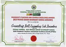 Grundtvig International Secondary School is a Nigerian independent boarding school in Oba, Anambra State, located just about twenty minutes’ drive from the Asaba Airport. It is named after Danish philosopher N. F. S. Grundtvig and is built upon his folk high school education-for-life principles for education. It educates boys and girls 12 to 18 years old and was founded in 1998 by Dr. Kachi E. Ozumba (1942–2011).The school has repeatedly featured among the top ten performing schools in Nigeria based on its West African Examinations Council (WAEC) results, and was ranked fifth in Nigeria in 2014.[1][2] In 2020, the School won the Presidential Award as the Overall Best Private Secondary School in Nigeria in the President's Teachers' and Schools Excellence Awards (PTSEA).[3] The award, which came with a brand new bus, was presented to the School at Abuja on 5 October 2020 as highlight of the events marking the World Teachers’ Day