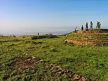 The archaeological site boundaries of Los Guachimontones consist of two ceremonial areas, numerous house mounds, and terraced hillsides covering an area of approximately 19 hectares.[26]: 3 However, remains of the site extend beyond the protected boundaries. The two ceremonial areas are Los Guachimontones, located on the hill slopes, and Loma Alta, located to the northeast on the hill top. Los Guachimontones consists of nine guachimontones, two ballcourts, a major and minor plaza, and numerous house mounds.[26] Loma Alta consists of five guachimontones, one ball court, and one major plaza.[28] Survey work from 2013 to 2017 has documented a total of twenty-five guachimontones within the protected boundaries of the site including the fourteen guachimontones at the two ceremonial centers.[29]