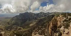 The Guadalupe Mountains reach their highest point at Guadalupe Peak, the highest point in Texas,[11] with an elevation of 8,751 feet (2,667 m).[12] The range lies southeast of the Sacramento Mountains and east of the Brokeoff Mountains. The mountain range extends north-northwest and northeast from Guadalupe Peak in Texas into New Mexico.[13] The northeastern extension ends about 10 miles (16 km) southwest of Carlsbad, near Carlsbad Caverns National Park; the southwest tip ends with El Capitan about 90 miles (140 km) east of El Paso. The mountains rise more than 3,000 feet (910 m) above the arid floor of the Chihuahuan Desert.[11] The Guadalupe Mountains are surrounded by the South Plains to the east and north, Delaware Mountains to the south, and Sacramento Mountains to the west.
