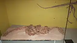 Specimen UFRGS PV0725T is articulated with hindlimbs tucked underneath its body and forelimbs flexed to the side. Although most of the neck is not preserved, the vertebrae at the base of the neck are present in UFRGS PV0725T and curve to the left, suggesting the entire neck was curved toward the left side of the body. The posture of this skeleton is similar to the resting position of birds, and is otherwise primarily known from advanced maniraptoran dinosaurs that are closely related to birds. It has also been observed in the dinosauriform Saltopus. Like living birds, Guaibasaurus may have rested in this position to conserve body heat.[4]