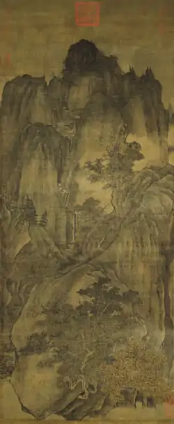 Guan Tong (simplified Chinese: 关仝; traditional Chinese: 關仝; pinyin: Guān Tóng; Wade–Giles: Kuan T'ung) (c. 906-960) was a Chinese painter of the Northern Landscape style during the Five Dynasties and Ten Kingdoms period and early Song dynasty from the city of Chang'an.[1] He was a pupil of Jing Hao, and known as a critical figure in the development of the era's monumental landscape painting.[2][3][4] His landscape paintings achieved a believable and compelling portrayal of the natural world, an achievement typifying the tenth-century artists drive in the portrayal of nature. The great popularity Guan's distinctive style achieved is one measure of the popularity of landscape painting at the time.[5]