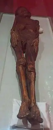 Guanche mummy of Madrid or Guanche mummy of Barranco de Herques, is a mummy of an ancient Guanche individual, which is now on display at the National Archaeological Museum of Spain in Madrid, Spain. The mummy is a male Guanche in an excellent state of preservation. Is believed to date from the twelfth and thirteenth centuries AD, and belongs to a man between 30 and 34 years and, according to experts, would be the best Guanche preserved mummy in the world. The individual in question, has all his teeth very well preserved, without any wear and tear, has "caucusian features" (including brown red hair) and his hands that do not reveal that he had done hard physical work. On the part of the Computerized axial tomography (CT) that was made to this mummy revealed that the viscera were not removed to mummify it and that in fact, it conserves the brain, which contradicts some historical Castilian chronicles that tell how was the mummification process between the Guanches.[1]
