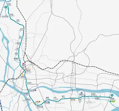 Line 8 of the Guangzhou Metro is a north-west L-shaped line on the system that runs from Jiaoxin to Wanshengwei, spanning a total of 33.9 km (21.06 mi)[4][5] with 28 stations. It interchanges with Line 1 at Chen Clan Academy, Line 2 at Changgang, Line 3 at Kecun, Line 4 at Wanshengwei and Line 6 at Cultural Park. All stations on Line 8 are underground.[6] Line 8's color is teal.