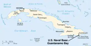 The United States assumed territorial control over the southern portion of Guantánamo Bay under the 1903 Lease.[1] The United States exercises jurisdiction and control over this territory, while recognizing that Cuba retains ultimate sovereignty. The government of Cuba regards the U.S. presence in Guantánamo Bay as an illegal occupation on the basis that the Cuban–American Treaty "was obtained by threat of force and is in violation of international law."[2] Some legal scholars judge that the lease may be voidable.[3] It is the home of the Guantanamo Bay Naval Base and the Guantanamo Bay detention camp located within the base, which are both governed by the United States. Since the 1959 revolution, Cuba has only cashed a single lease payment from the United States government.[4]