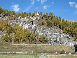 The castle is located on a hill west of the village of Madulain. A marked walking trail leads from the train station to the castle. The trail climbs up the eastern side of the hill and arrives at an entrance in the south-east corner. The castle was protected on the mountain or north side by a ditch. The main tower is on the west side of the complex. Some of the medieval plaster and even the trowel marks are still visible on the tower.[1] The high entrance is located on the south side on the second level. The tower is about 10 meters (33 ft) tall. The holes for heavy wooden beams that once supported a wooden balcony or platform are still visible near the top of the tower.