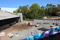 The attraction was announced as part of an overhaul of Epcot at the 2017 D23 Expo.[5] Ellen's Energy Adventure closed on August 13, 2017 and construction of the roller coaster began later in the same month.[12] The show building that housed Universe of Energy was reused and retrofitted for the new attraction. The roller coaster itself is housed in a new, massive show building situated backstage behind the Universe of Energy building and the PLAY! pavilion,[13][14] which utilized 960 truckloads of concrete for its foundation.[4] The first track piece of the ride was installed November 2018.[15]
