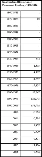 Up until the 1960s, Guatemalan migration to the US was negligible.[2] The Department of Homeland Security's (DHS) Office of Immigration Statistics notes the first trickles of migration in the 1940s and 50s, but migration truly began to increase through the 1970s and 80s.[3] By the 1990s, more than 100,000 migrants were coming into the US by means of green cards each decade and then that number slightly dipped in the early 2000s.[3] More recent data is harder to gauge, as majority of Guatemalan migration is predicted to be unauthorized.[4] The US Census data in 2000 marked 372,487 Guatemalans in the US and by 2010, the number had reached over 1 million, showing a 183% increase in Guatemalans in the US over the decade. This shows that even though legal migration may have slowed, migration as a whole from the country is on the rise.[1]