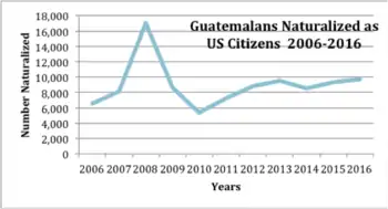 Very few Guatemalans have furthermore been granted citizenship. DHS data traces a range of about 6,500-9,700 Guatemalans granted citizenship annually since 2006.[9] In 2015, only 27% of the Guatemalans in the US were citizens.[10] Many Guatemalans, who are undocumented or on a temporary status, are blocked from a pathway to citizenship.[11] Facing immigration restrictions, such as the ceiling placed on relative-based immigration in the Immigration Act of 1990 and the massive amounts of border patrol that have increased through acts in 1996, 2001, 2005, and 2006, Guatemalans have predominantly had to enter the US without documentation.[12]