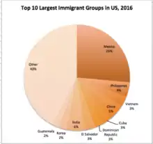 In the past decade, legal Guatemalan migration to the US has been predominantly through immediate relative petitions[5] and family sponsorship,[6] whereas "temporary" visas[7] have been granted primarily through the H2A and H1A programs for seasonal agricultural and non-agricultural labor.[8] These numbers are relatively small though (in 2016, about 13,000 Guatemalans were granted legal permanent residency, compared to about 174,500 Mexicans, Guatemala's neighbor, and about 7,500 Guatemalans were granted temporary work visas, compared to about 843,500 Mexicans).[8]
