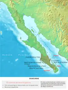 There is no evidence that the Guaycura were ever united politically, but rather consisted of a large number of independent bands, each with their own territory and sometimes hostile to each other. Known band names of probable Guaycura speakers living near the Bay of La Paz are Cubí (or Cora), Huchiti (or Uchiti), Aripe, Callejúe, and Cantile.[4] Most bands probably consisted of about 500 persons. The Monqui also possibly spoke a Guaycura language or dialect. The Guaycura occupied a territory of about 25,000 square kilometres (9,700 sq mi) of austere deserts and mountains with few sources of fresh water.[2][5]