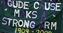 Among the many of banners seen at the 1909 procession was one which read "A Gude Cause Maks a Strong Arm"; a rallying call the organisers felt was as true in 2009 as it was in 1909. And so "Gude Cause" was adopted as the name for the organisation.[2]