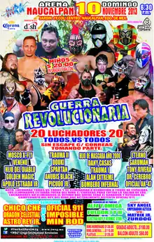 Beginning in 2009 the Mexican wrestling promotion International Wrestling Revolution Group (IWRG; Sometimes referred to as Grupo Internacional Revolución in Spanish) held an annual show called Guerra Revolucionaria ("The Revolutionary War"), a reference to the Mexican revolutionary war (1810–1821). The main event match, the eponymous Guerra Revolucionaria, a 20-man "over the top" Battle Royal where all 20 wrestlers start out in the ring. Once a wrestler is thrown over the top rope to the floor that wrestler is eliminated from the actual match, from that point on they will act as a "Lumberjack" outside the ring, ensuring that none of remaining competitors try to escape the ring. Each "lumberjack" is given a leather strap that they are allowed to use on anyone that leaves the ring. There is no specific "award" for winning the Guerra Revolucionaria tournament. The multi-man match often allows IWRG to intersect various ongoing storylines as another step in the escalating tension. At other times, the match itself was used as a way to start new feuds due to interactions inside or outside the ring. The Guerra Revolucionaria shows, as well as the majority of the IWRG shows, in general, are held in Arena Naucalpan, owned by the promoters of IWRG, and it is their main venue.[2] The 2013 Guerra Revolucionaria show was the fourth time that IWRG held an event under that label, having not held a Guerra Revolucionaria show in 2012.[3][4][5] The first three Guerra Revolucionaria tournaments did not offer a specific, actual reward to the winner of the match, but for the 2013 tournament IWRG announced that the winner of the match would become the number one contender to the IWRG Rey del Ring Championship.[1]